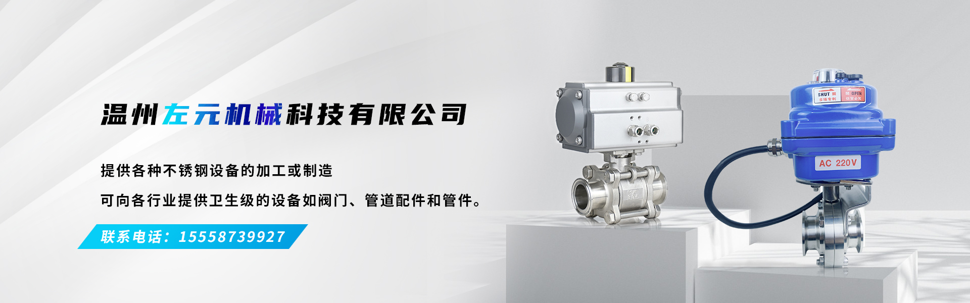 溫州左元機械科技有限公司成立與 2015 年,位于浙江省溫州市濱海園區(qū)十四路,主要經營包括衛(wèi)生級手動球閥、氣動球閥、電動球閥、衛(wèi)生級手動蝶閥、氣動蝶閥、電動蝶閥、衛(wèi)生級取樣閥、卡箍、管支架, 以及灌裝設備系列,管件系列等